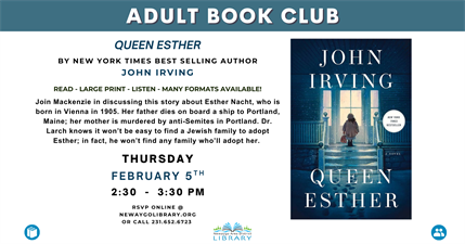 Come to the February Book Club at Newaygo Library to discuss Queen Esther by John Irving!