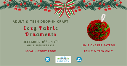 Adults and teens are invited to drop into the library and create festive no-sew ornaments using fabric squares and styrofoam balls. Craft a cozy, homespun decoration that’s perfect for your tree—or to give as a heartfelt holiday gift.