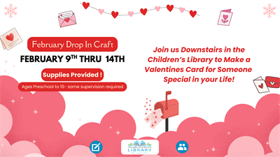 During the week of Feb. 9th through Feb. 14th, stop in downstairs in the children's section to make a Valentine's Day Card for someone special!