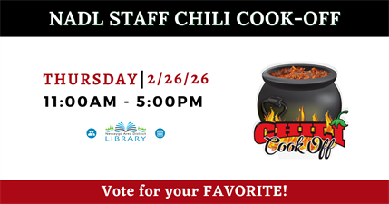 Stop into the Library on Thursday, February 26th, between 11 AM - 5 PM to vote for your favorite chili!