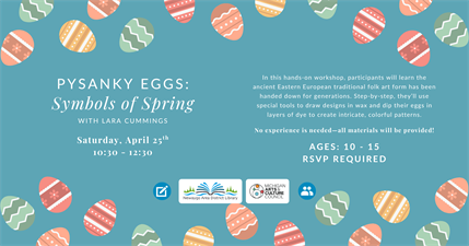 Join us on April 25, 2026 from 10:30AM – 12:30PM for a Pysanky Egg Class with instructor Lara Cummings, designed for ages 10–15!